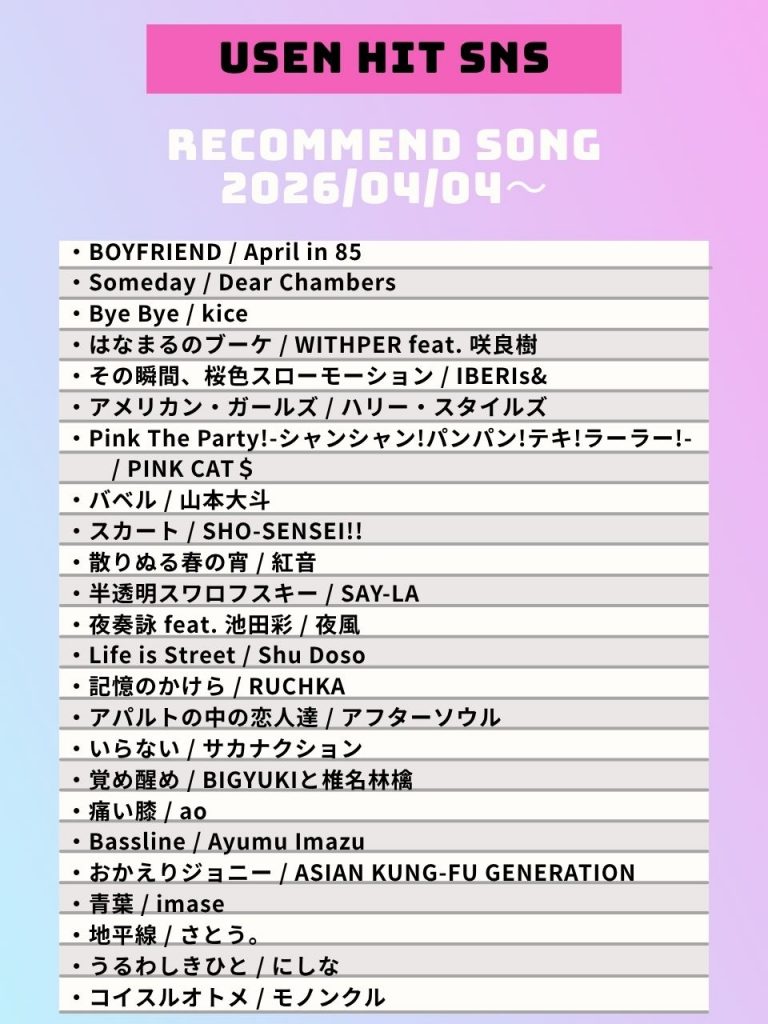 USEN 4/4付 ON AIR情報 Published / 2026.04.04 KAZE JAPAN RECORD > discography > USEN 4/4付 ON AIR情報 ツイート はてブする 紅音/散りぬる春の宵作詞:真戸原直人(アンダーグラフ)作曲:柴田晃一 USEN推し活リクエスト 🍀USEN推し活リクエスト🍀紅音(あかね)毎日18:00更新!いちにち一回ポチ活!!